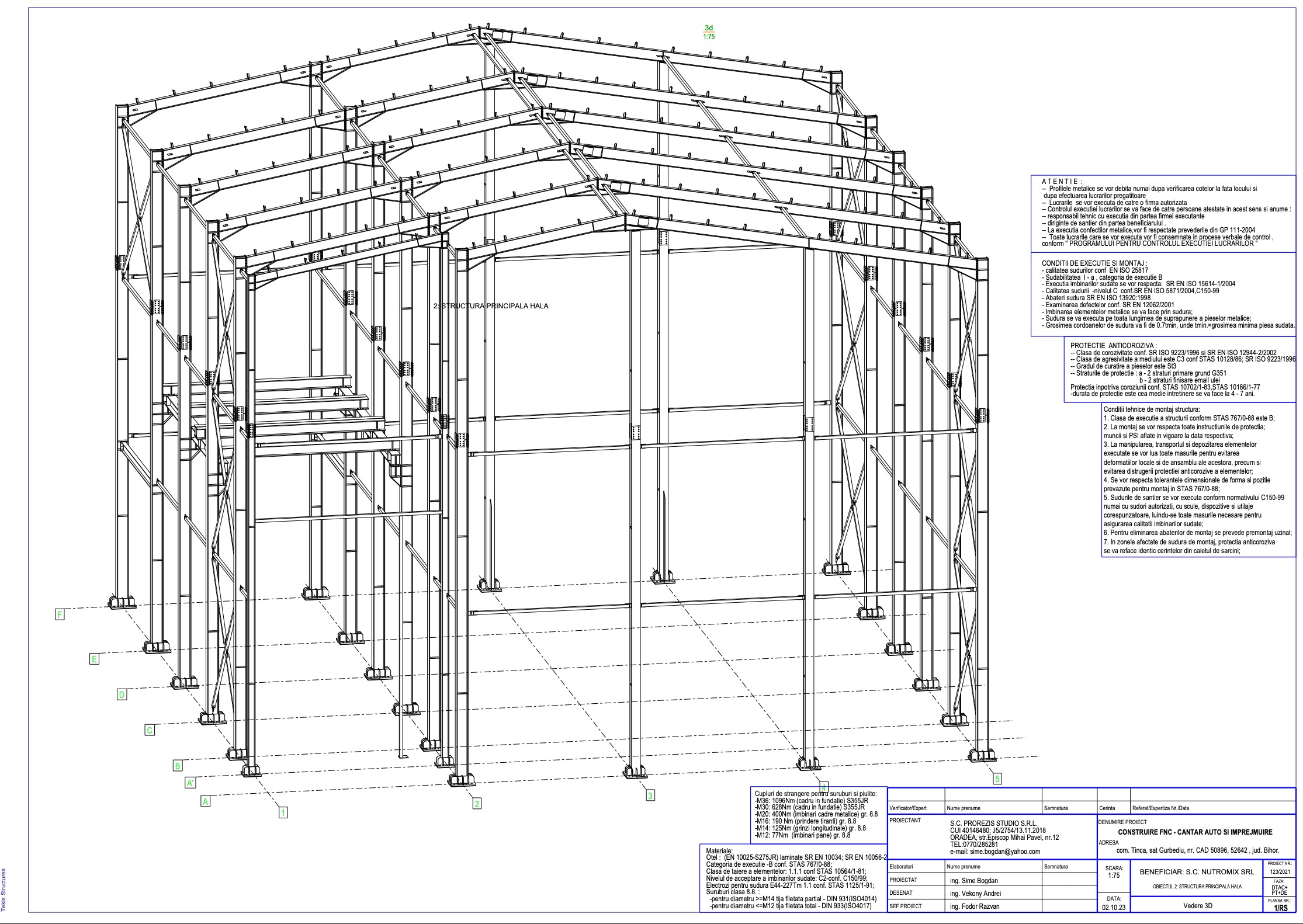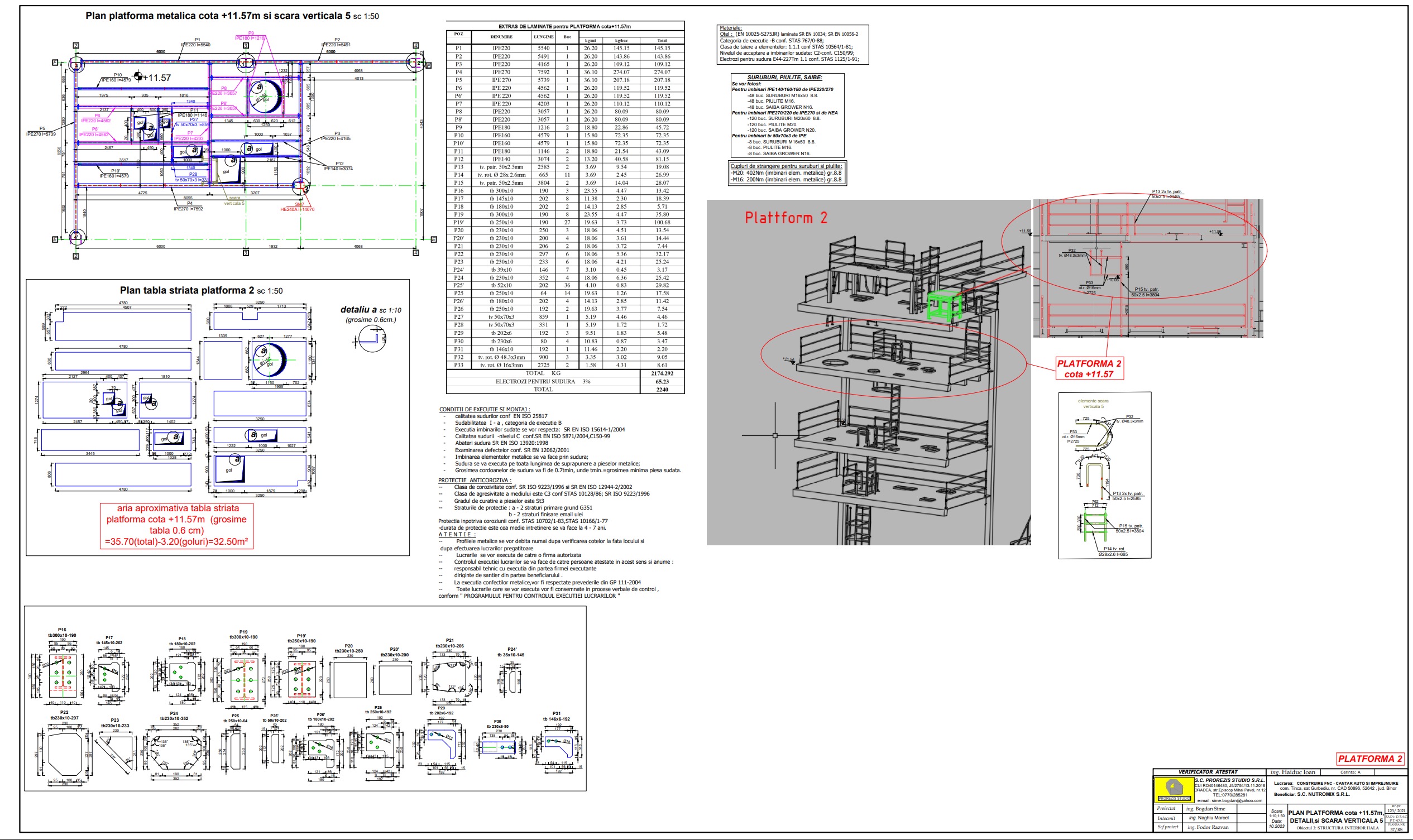 • Piese metalice: OL37 (S235JR), suduri continue electrice, îmbinări clasa C2, șuruburi/piețe 8.8 și 10.9