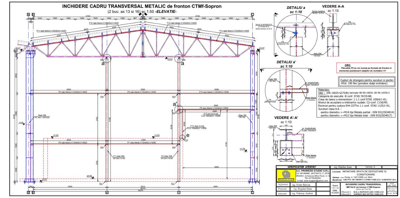 • Detalii ferme metalice (24.76 m și 16.21 m), elevații și extrase laminate; contravântuiri CVC/CVP