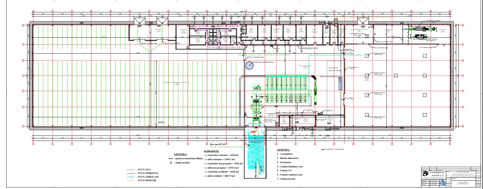 Proiectul prevede construirea unei hale industriale pentru creșterea găinilor ouătoare, cu spații interioare dedicate adăpostirii efectivelor, zonelor de colectare și manipulare a ouălor, precum și spații tehnice și platforme betonate exterioare pentru circulații și utilaje.