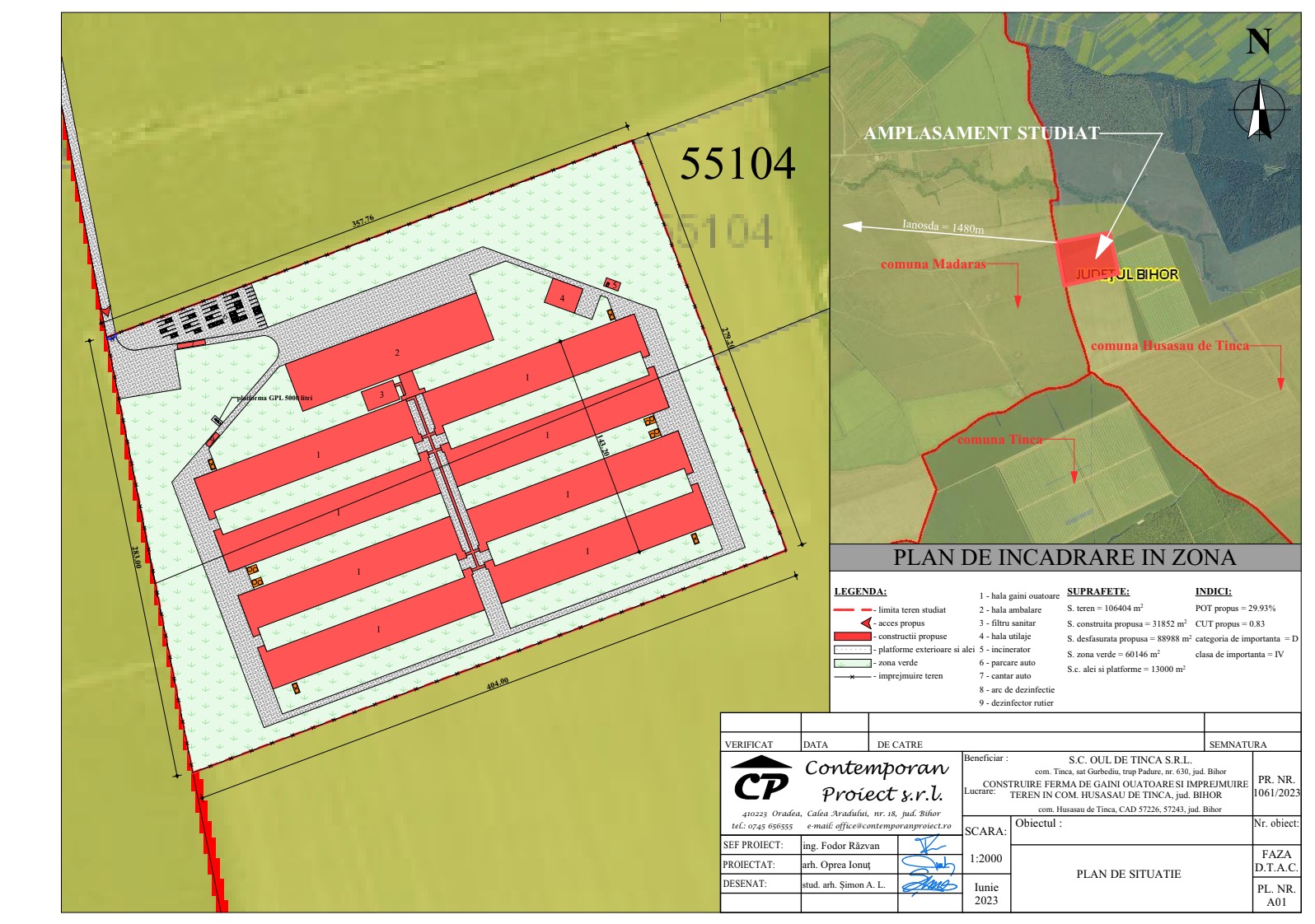Proiect pentru realizarea unei ferme moderne de găini ouătoare, care include hale de producție, spații de ambalare, utilități, infrastructură tehnologică și împrejmuire teren, amplasată în comuna Husașău de Tinca, județul Bihor.