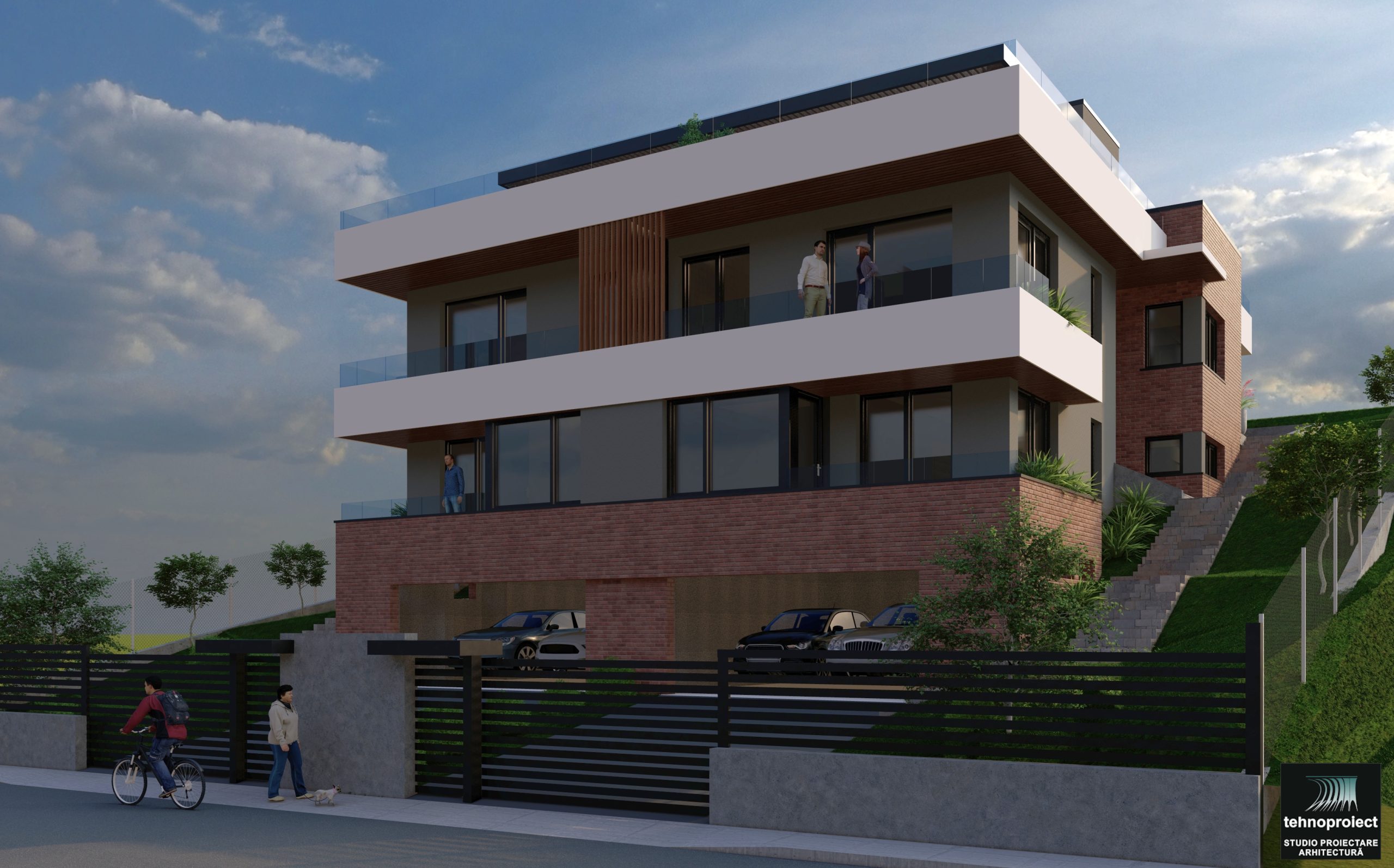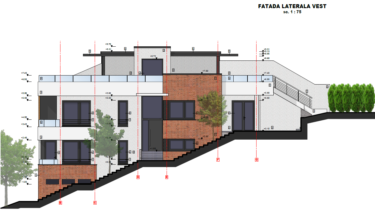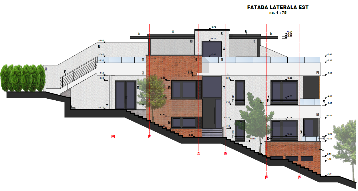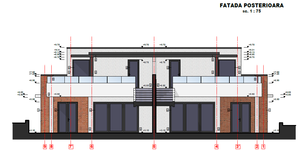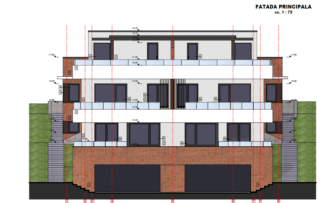 Proiect pentru construire casă Duplex P+E, compusă din două unități locative pe trei niveluri, cu regim de înălțime Demisol + Parter + Etaj și terasă circulabilă.