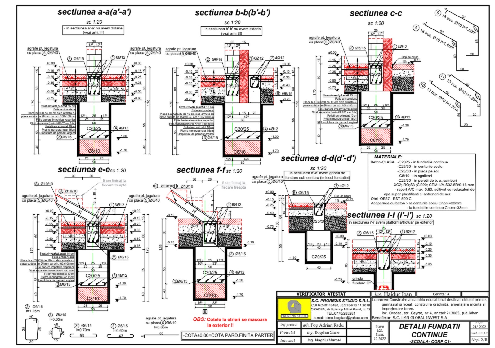 • Școală (C1): 1–16/R: Plan fundații, detalii lift, armare, fundații izolate F1–F11, grinzi fundare